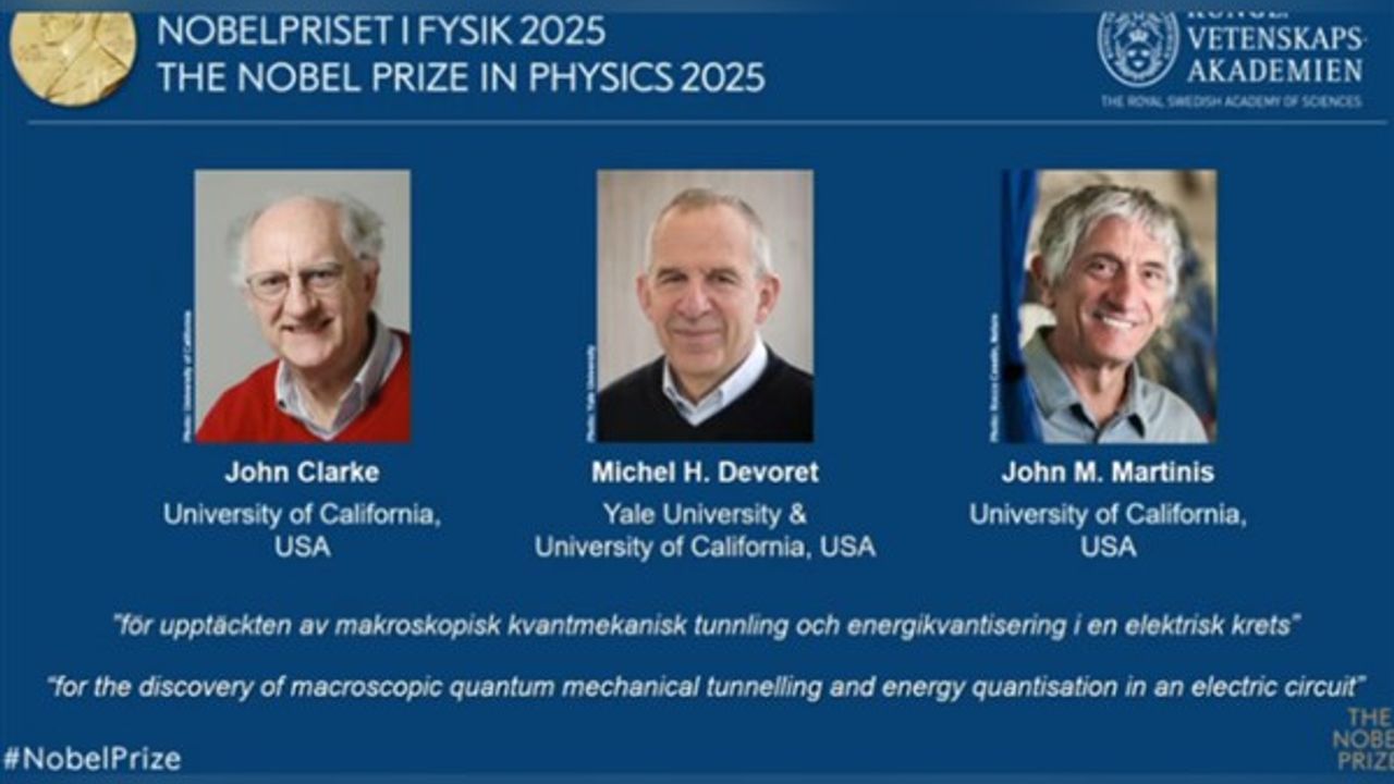 2025 Nobel Fizik Ödülü, "elektrik devresinde makroskopik kuantum mekanik tünelleme ve enerji kuantizasyonunun keşfine" ilişkin çalışmalarından dolayı İngiliz John Clarke, Fransız Michel Devoret ve ABD'li John Martinis'e verildi.