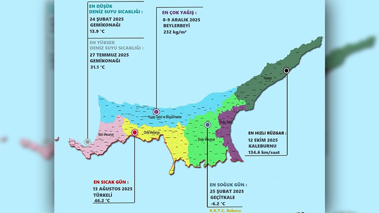 Hava sıcaklığının -6.2 derece olduğu 25 Şubat en soğuk gün, hava sıcaklığının 46.2 derece olduğu 13 Ağustos ise en sıcak gün olarak açıklandı. En soğuk gün Geçitkale’de, en sıcak gün ise Türkeli’de yaşandı.