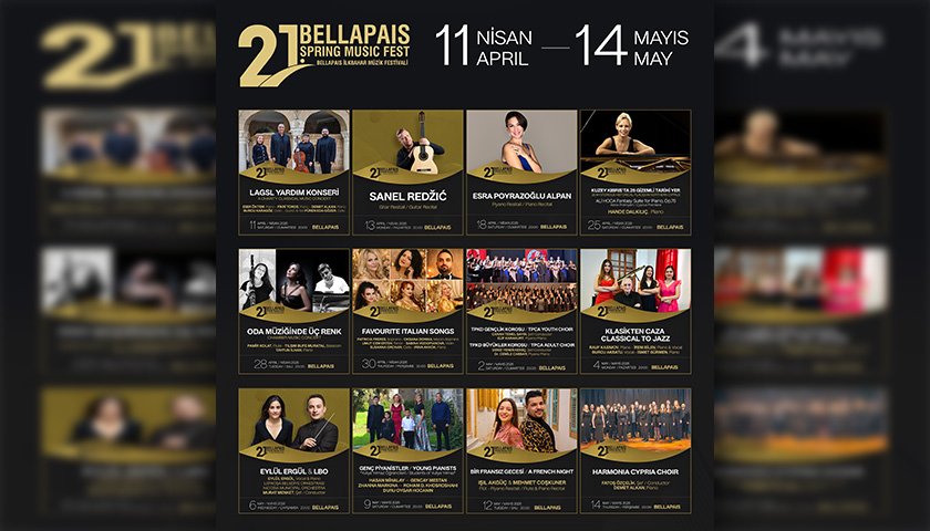 21. Uluslararası Bellapais İlkbahar Müzik Festivali programı kapsamında, 11 Nisan’da LAGSL Yardım Konseri, 13 Nisan’da Sanel Redzic Gitar Resitali, 18 Nisan’da Esra Poyrazoğlu Alpan Piyano Resitali, 25 Nisan’da Kuzey Kıbrıs’ta Gizemli 25 Tarihi Yer “Ali Hoca Fantasy Suite for Piano, Op.76” Hande Dalkılıç Piano, 28 Nisan’da Oda Müziğinde Üç Renk, 30 Nisan’da Favourite Italian Songs, 2 Mayıs’da TPKD Gençlik Korosu Ve Büyükler Korosu, 4 Mayıs’ta Klasikten Caza, 6 Mayıs’ta Eylül Ergül & LBO, 9 Mayıs’ta Genç Piyanistler, 12 Mayıs’ta Bir Fransız Gecesi ve 14 Mayıs’ta Harmonia Cypria Choir konserleri yer alacak.