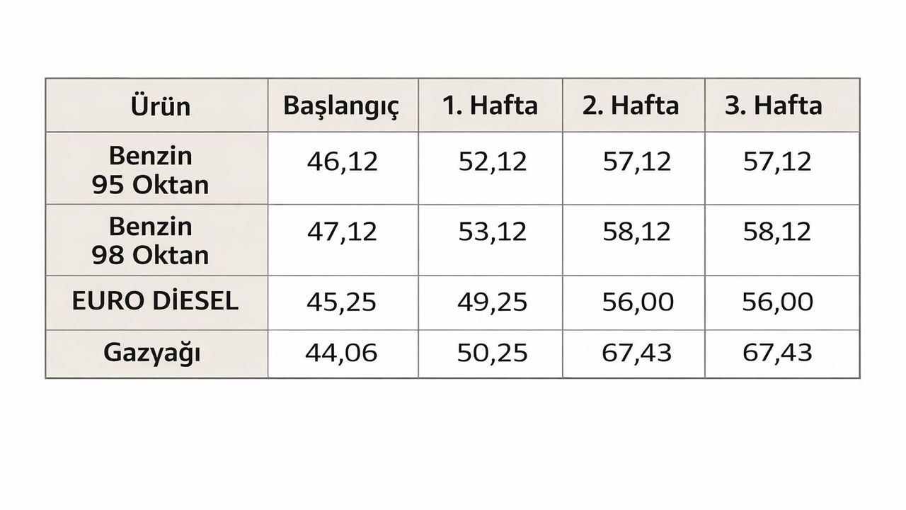 Resmi Gazete’de yayımlanan karara göre, 12 Mart’ta fiyat güncellemesi yapılan akaryakıt ürünlerinde; 95 oktan benzin 57,12 TL, 98 oktan benzin 58,12 TL, euro diesel 56,00 TL ve gazyağı 67,43 TL olarak uygulanmaya devam edecek.