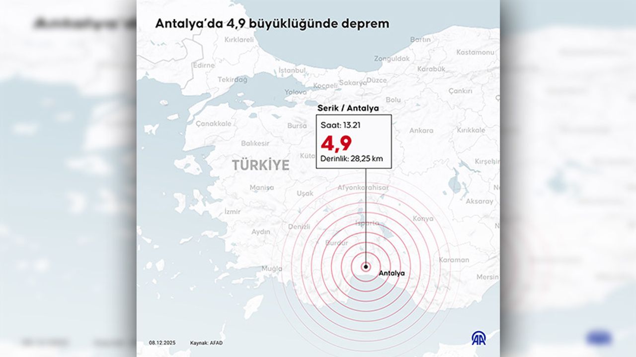 Antalya'nın Serik ilçesinde, saat 13.21'de 4,9 büyüklüğünde deprem meydana geldi.