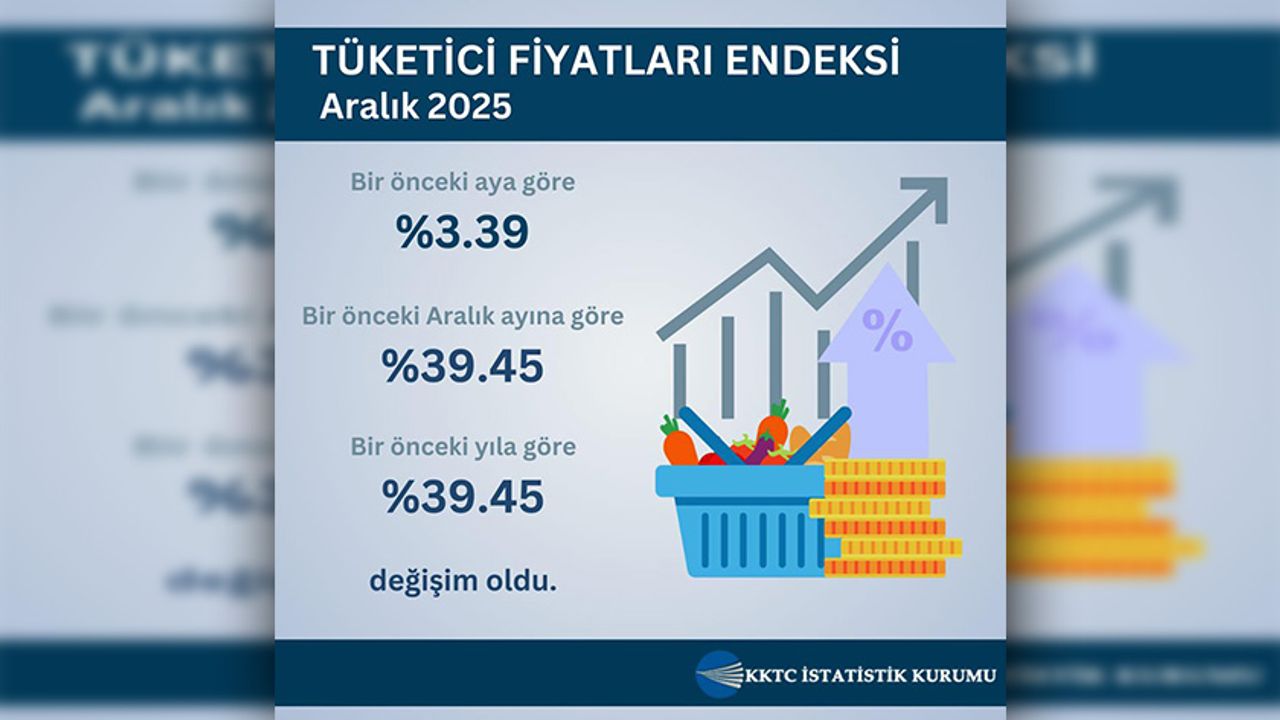 KKTC İstatistik Kurumu’nun Tüketici Fiyatları Genel Endeksi’nde, bir önceki aya göre yüzde 3,39, bir önceki yılın aralık ayına göre yüzde 39,45 ve bir önceki yılın aynı ayına göre yüzde 39,45 değişim yaşandı.