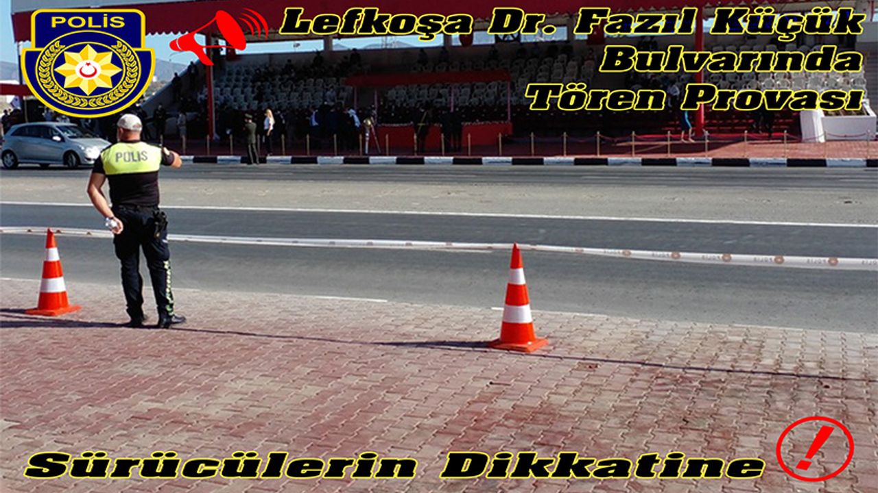 Polis Genel Müdürlüğü'nden verilen bilgiye göre, saat 07.00’den itibaren, Lefkoşa Dr. Fazıl Küçük Bulvarı’nın Gönyeli Çemberi ile Altınbaş Petrol Trafik Işıkları Kavşağı arasında kalan yol güzergahı, tören provasının sona ereceği saate kadar trafik akışına kapatılacak.