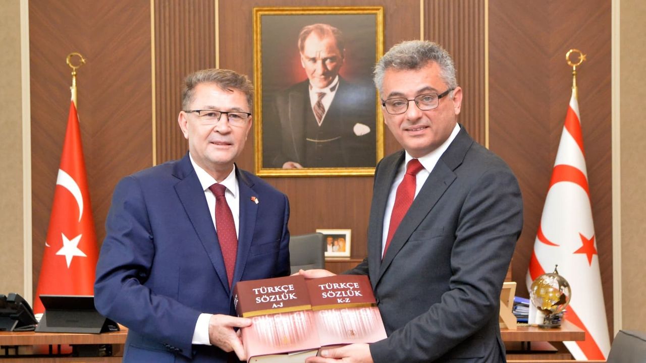 Türk Dil Kurumu Başkanı Prof. Dr. Osman Mert de yaptıkları çalışmalar hakkında bilgi vererek, Cumhurbaşkanı Erhürman’a Türkçe Sözlüğü’nün son baskını takdim etti.