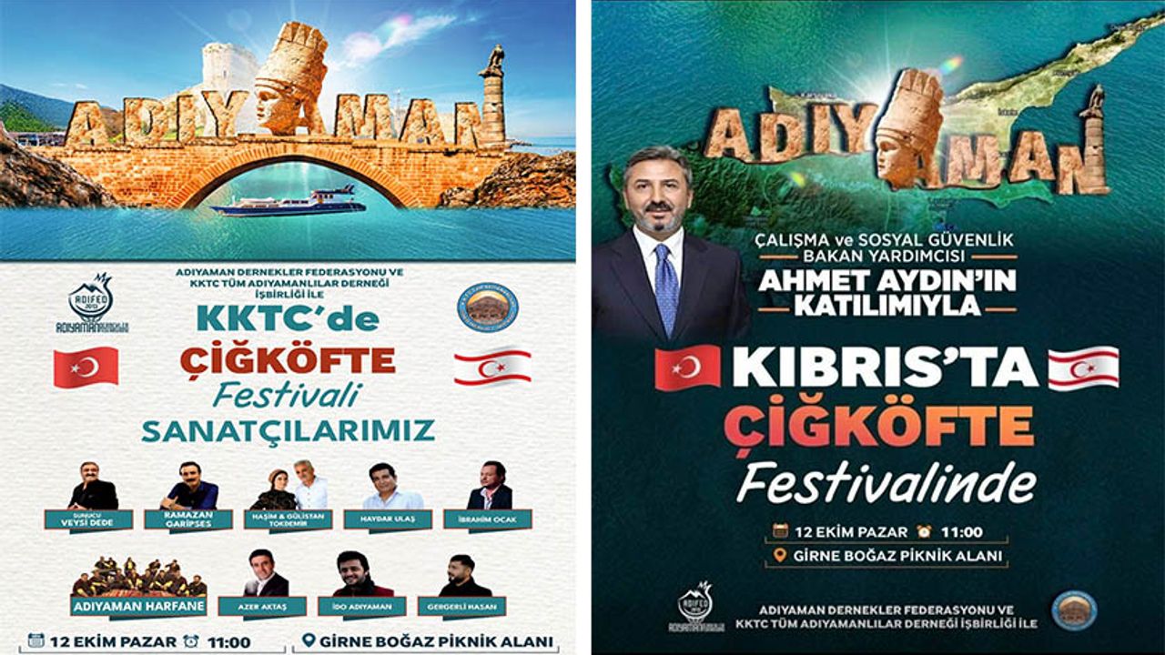 Adıyaman Dernekler Federasyonu ve KKTC Tüm Adıyamanlılar Derneği iş birliğinde Girne Boğaz Piknik Alanı’nda bu pazar Çiğ Köfte Festivali yapılıyor. Adıyaman Dernekleri Federasyon Başkanı Hüseyin Sevinçtekin yaptığı açıklamada, KKTC ve Türkiye’de yaşayan tüm Adıyamanlılar ile Kıbrıs halkını Adıyaman kültürünün simgesi olan çiğ köfte etrafında buluşturmak amacıyla bu festivali düzenlediklerini belirtti.