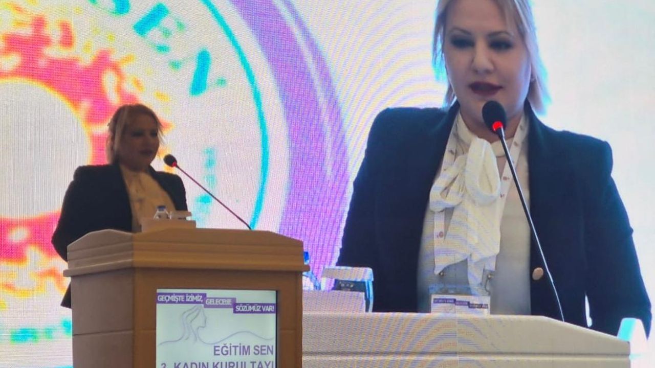 KTÖS İnsan Hakları ve Eşitlik Sekreteri Sevgi Erhalaç, kurultayda toplumsal cinsiyet eşitliği ve kadın politikaları üzerine konuşma yaptı.