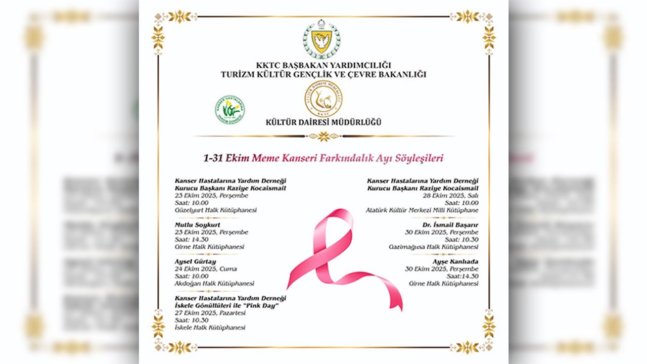 Başbakan Yardımcılığı Turizm Kültür Gençlik ve Çevre Bakanlığı’na bağlı Kültür Dairesi, 1-31 Ekim Meme Kanseri Farkındalık Ayı için Milli Kütüphane ve Halk Kütüphanelerinde söyleşiler düzenliyor.