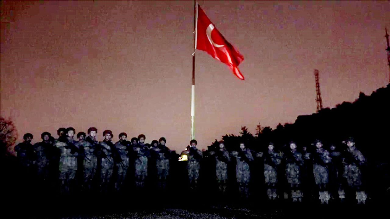 Paylaşımda, görev başındaki Mehmetçiğin depremin gerçekleştiği dakikalarda Türk bayrağının altında saygı duruşunda bulunduğu görüntülere de yer verildi.