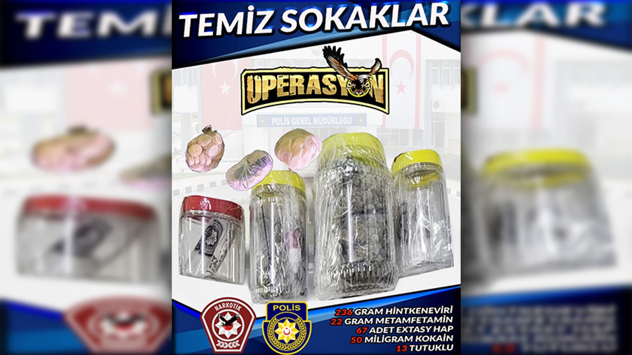 Polis tarafından Gazimağusa, Girne ve İskele’de düzenlenen operasyonda, satışa hazır paketler halinde hintkeneviri, metamfetamin, kokain, sentetik cannabinoid ve MDMA türü uyuşturucu maddeler ele geçirildi, 13 kişi tutuklandı.