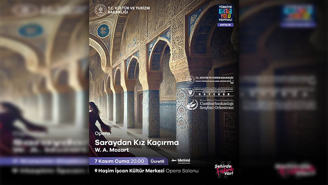 Devlet Opera ve Bale Koordinasyon Merkezi (KKTCDOB), TC Kültür ve Turizm Bakanlığı Devlet Opera ve Balesi Genel Müdürlüğü (TCDOBGM) ve Cumhurbaşkanlığı Senfoni Orkestrası'nın (KKTCCSO) ortak prodüksiyonu “Saraydan Kız Kaçırma” operası, Antalya Kültür Yolu Festivali kapsamında sanatseverlerle buluşuyor.