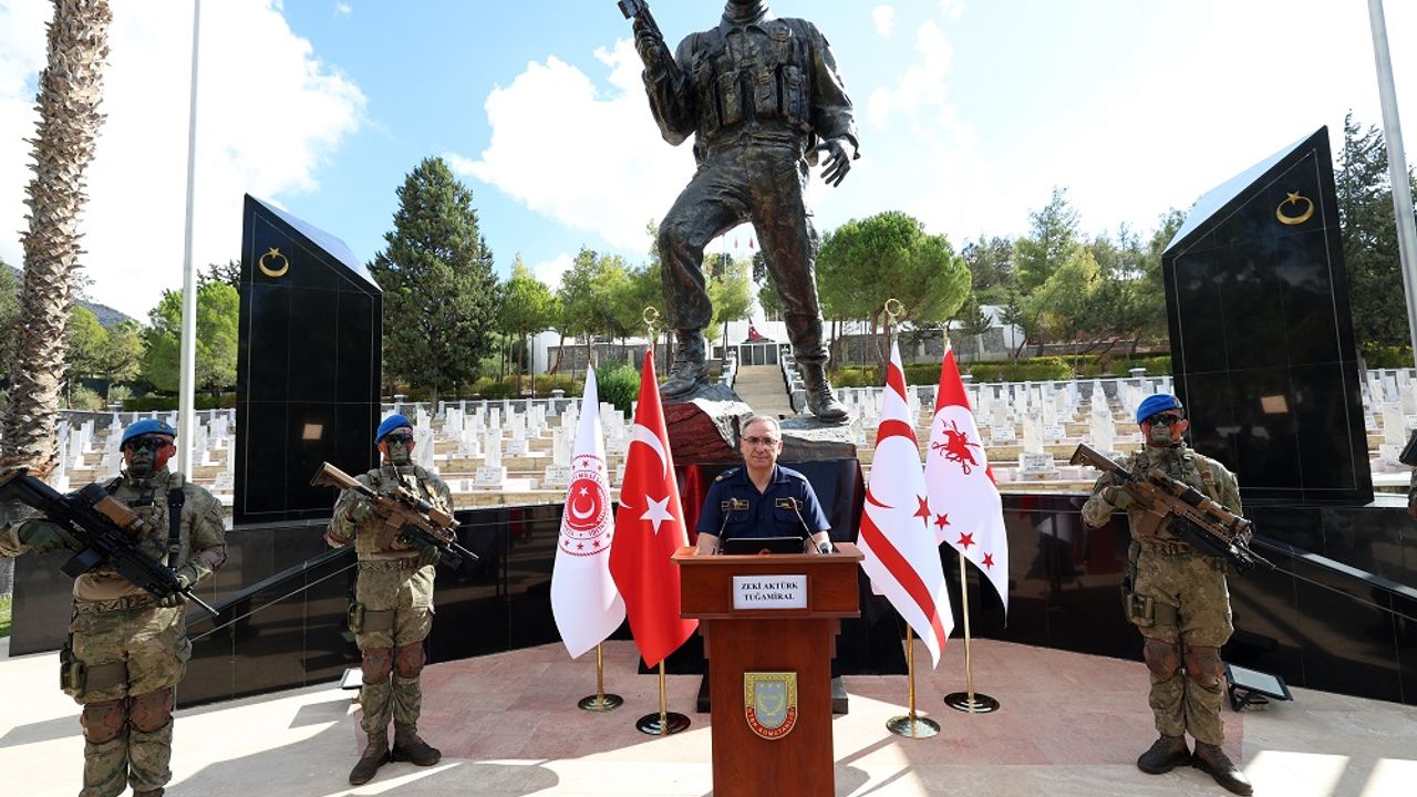 MSB Basın ve Halkla İlişkiler Müşaviri ve Bakanlık Sözcüsü Tuğamiral Zeki Aktürk, 20 Temmuz 1974'te gerçekleştirilen Kıbrıs Barış Harekatı'nda vatan ve millet uğruna şehit olan kahraman Mehmetçiğin ve mücahitlerin yan yana yattığı Girne Boğazköy Şehitliği'nde düzenlenen haftalık basın bilgilendirme toplantısında konuştu.