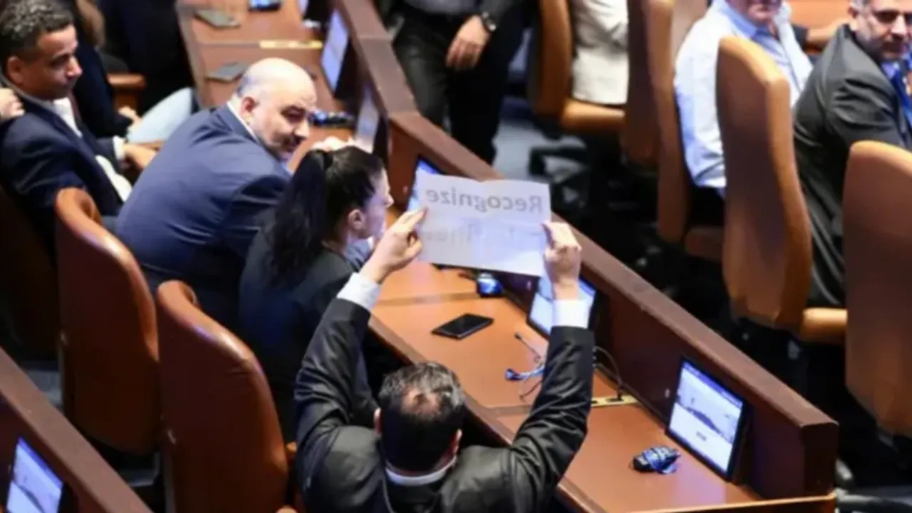 Filistin asıllı milletvekili Eymen Avde, daha sonra sosyal medya hesabından, "Filistin'i tanıyın." yazılı pankartı tuttuğu fotoğrafını paylaştı.