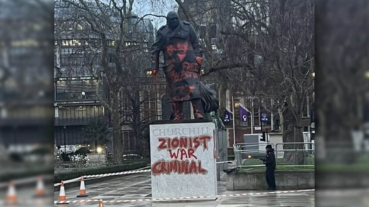 Londra'daki Parlamento Meydanı'nda bulunan eski İngiltere Başbakanı Winston Churchill'in heykeline, kırmızı boyayla "Siyonist savaş suçlusu" ve "Soykırımı durdur" yazıldı.