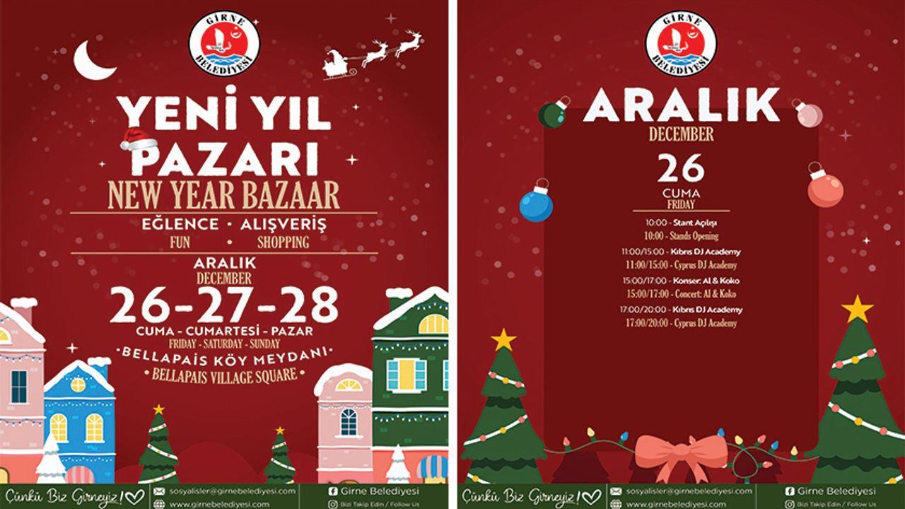 Girne Belediyesi tarafından düzenlenen Yeni Yıl Pazarı, 26–27–28 Aralık tarihlerinde Bellapais Köy Meydanı’nda ziyaretçilerini ağırlamaya hazırlanıyor.