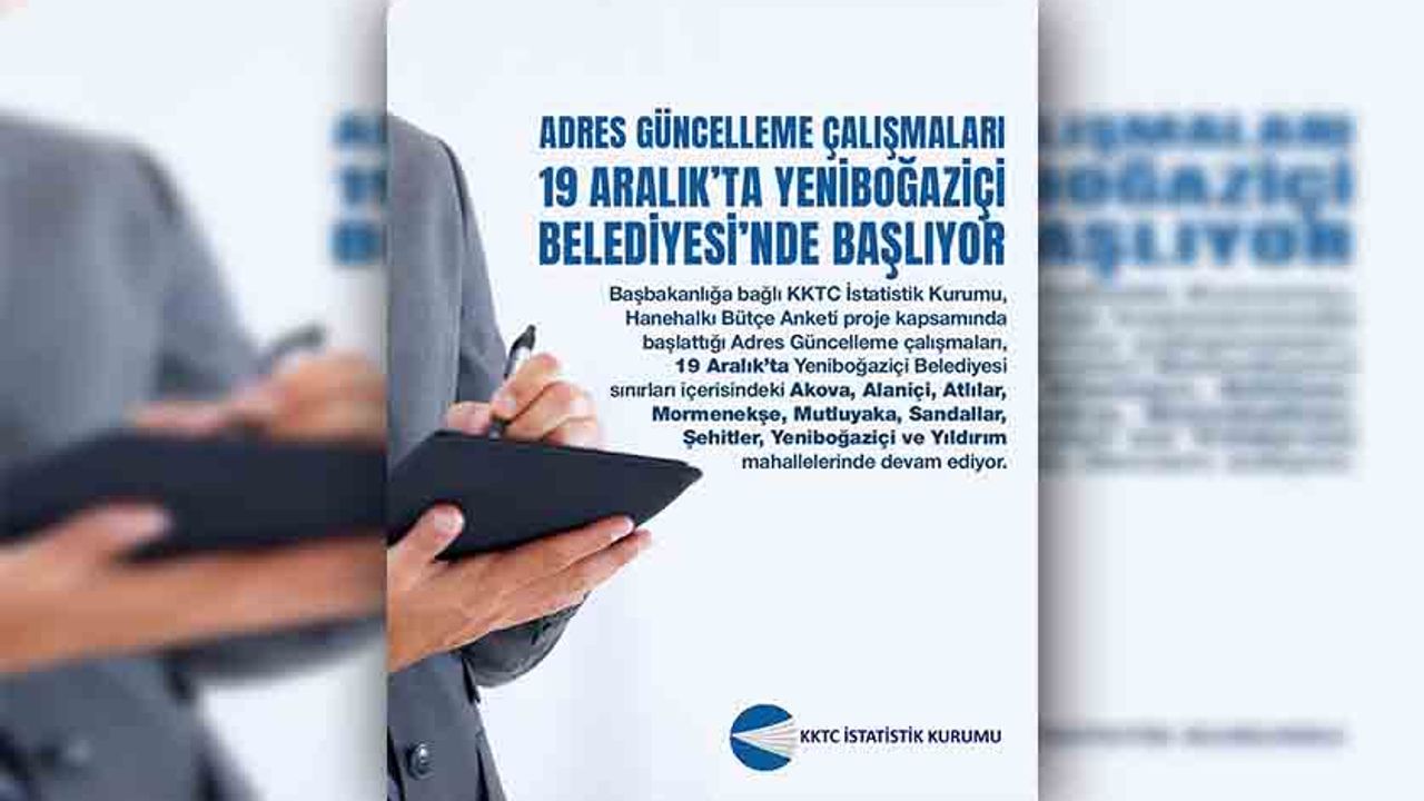 Kurumdan verilen bilgiye göre, Başbakanlığa bağlı KKTC İstatistik Kurumu Hanehalkı Bütçe Anketi projesi kapsamında başlattığı adres güncelleme çalışmalarına bugünden itibaren Yeniboğaziçi Belediyesi sınırları içindeki Akova, Alaniçi, Atlılar, Mormenekşe, Mutluyaka, Sandallar, Şehitler, Yeniboğaziçi ve Yıldırım köylerinde devam edilecek.